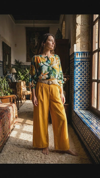 C'est ça, cette collection. Des pièces qu'on enfile au réveil et qu'on porte toute la journée. Du lin, du coton, des coupes qui respirent. Des couleurs douces — le bleu des zelliges, le crème des murs, l'orange d'un coussin posé là.